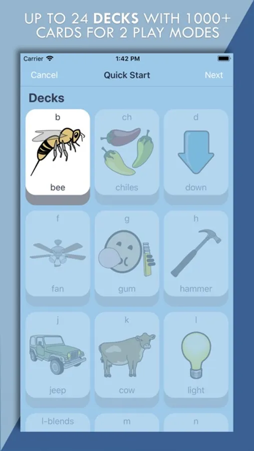Utilizing fun and modern graphics, ArtikPix is a free application offering the 'b' deck with 23 additional decks available as In App Purchases: ch, d, f, g, h, j, k, l, l-blends, m, n, p, r, r-blends, s, s-blends, sh, t, th, v, w, y, z. ArtikPix has a total possible 24 decks with 40 cards each (113 cards in r deck, 1,033 total cards). As part of a step-by-step process, decks and corresponding sound positions are configured for student profiles. The configurations are saved for each student, so they are automatically available in the activities.
