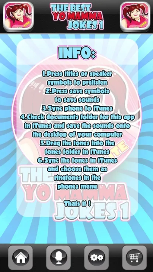 Every joke can be played back as a funny sound by pressing the speaker button or title and can be saved as a ringtone. With just a few clicks, you can use the your favorite YO MAMMA joke asa ringtone !