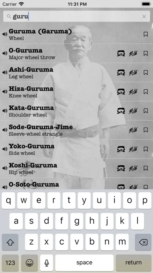 - Powerful, searchable dictionary, which includes over 675 Judo terms and their English translations (alternatively: German, French, Spanish, Italian, Japanese). Enter partial English words or Judo terms for an instant list of possible matches. For terms which correspond to specific techniques, navigate directly to either the Gokyo or Technique (Waza) viewer. Terms can be heard as expressed by a Japanese native speaker. We call this the "speaking dictionary".