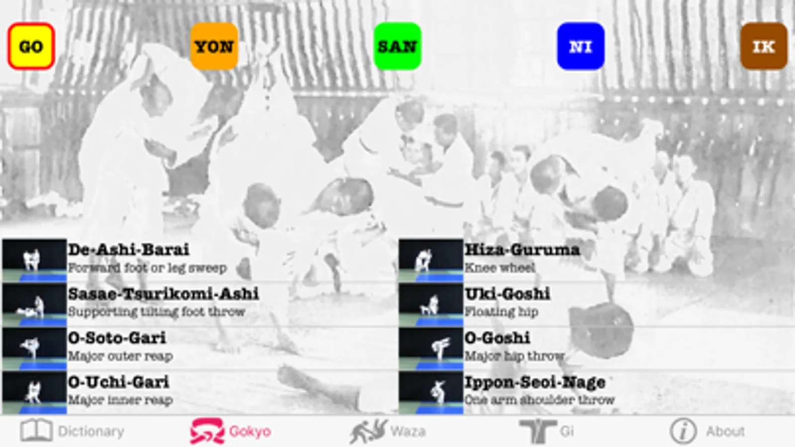 - Video Tutorials: Just click on the technique you've located using either the Dictionary, Gokyo or Technique viewer, and watch Judo black-belts perform said techniques from multiple angles, as well as in slow-mo.