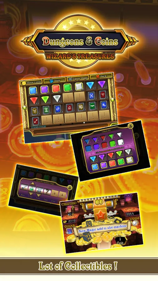 Dungeons & Coins take the medal game in to next level. Now you are not only pushing the coins, you need to use your unique strategy to create combo and generate giant bonuses. Play with fun and full of adventure! You need to help the little witch to defect the enemies in the dungeons and get the wizard's treasure. When you conquer a level, you will have a chance to get new spells. Once you learn more spell, you can have more special bonuses, combo or even coins.