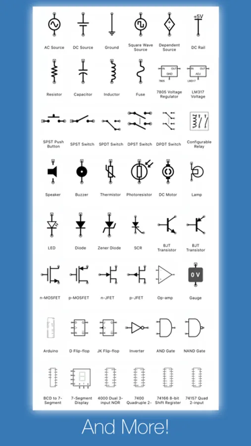There are over 300 elements you can use to build your circuits. The app has everything from a programmable Arduino, to simple resistors, to switches, to MOSFETS, to digital gates.