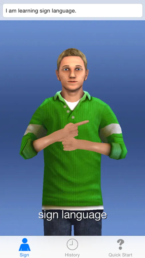 If you are interested in learning the alphabet, type in ABCDE, etc. with NO space in between each letter. The character will show you what each letter sign looks like.
