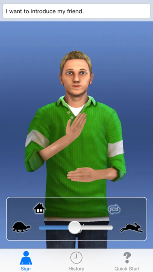 Use the controls to speed up or slow down the signing; turn on or off the looping feature; and send the character to his “home” or default position.