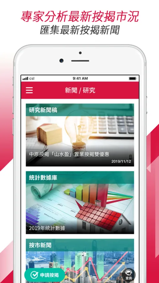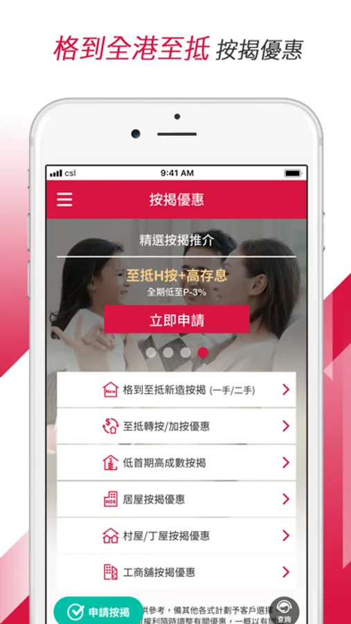 本軟件結合提供多元化功能,讓您緊貼樓按最新資訊,計劃置業財務安排,並可即時提交按揭轉介申請。