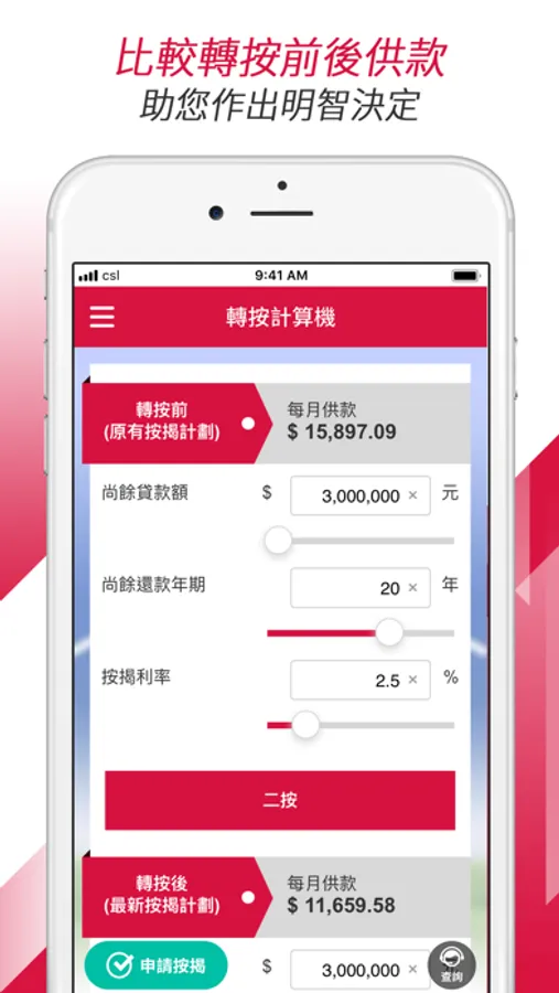 轉按計算機 - 即時比較轉按前後的每月供款及套現金額,一目了然。
