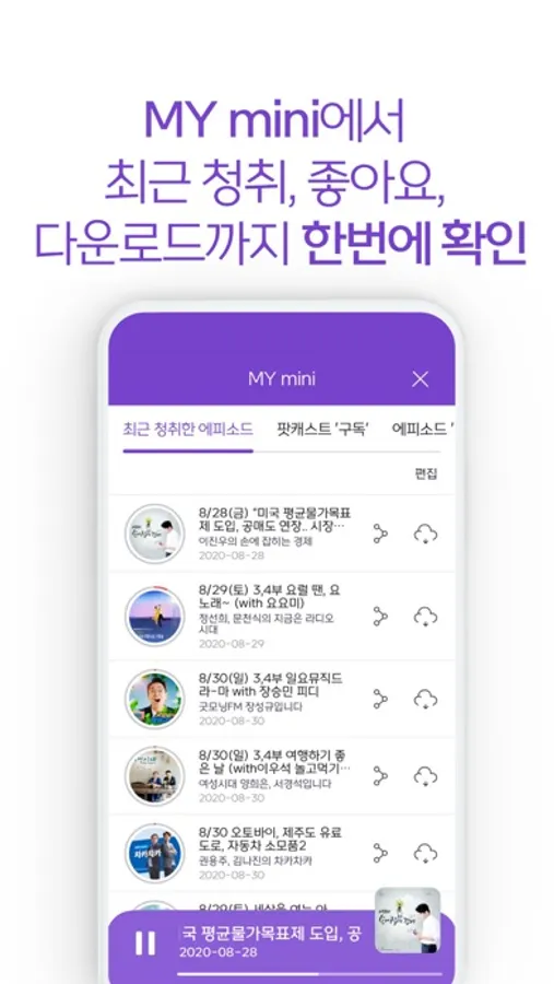 7. MY mini - 최근 청취한 에피소드, 팟캐스트 구독, 선곡 좋아요, 에피소드 좋아요 제공