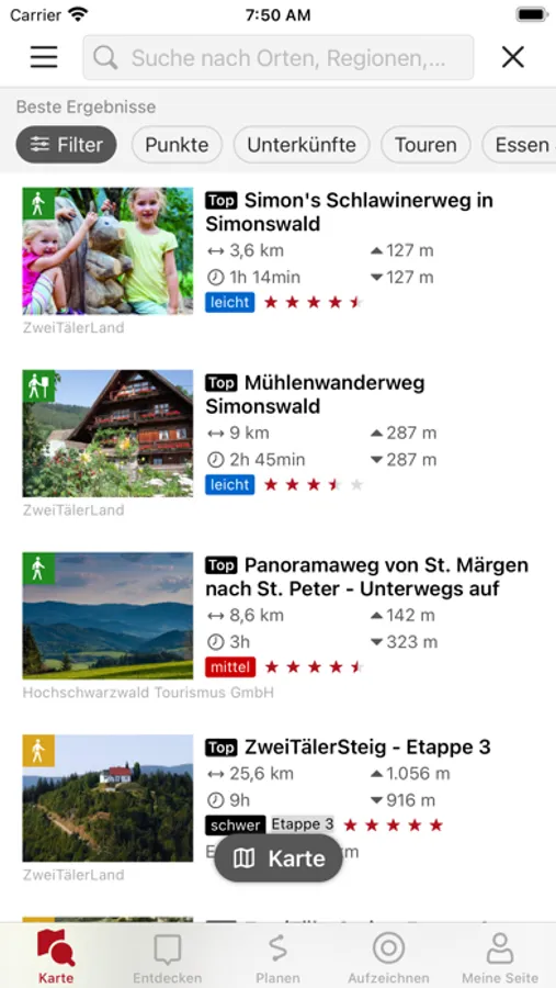 Mit der neuen Version der Schwarzwald-App erhalten Sie über 4.000 Tourenvorschläge mit nützlichen Beschreibungen und detaillierten Karten für Wanderer, Radfahrer, Wintersportler, Familien und weitere Aktivitäten. Zudem finden Sie zahlreiche Ausflugsziele, die Sie sich nach Kategorien sortiert anzeigen lassen können. Ebenso sind über 5.000 Gastgeber gelistet, die Sie direkt aus der App kontaktieren können. Alle Touren können offline gespeichert werden, damit die Orientierung auch ohne Netzempfang funktioniert.