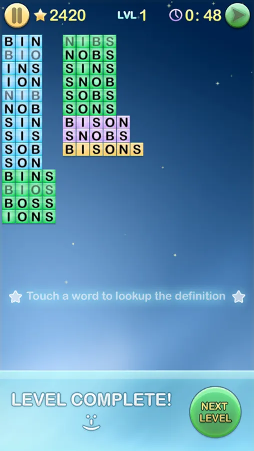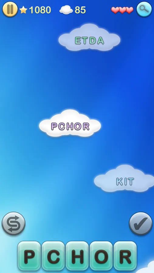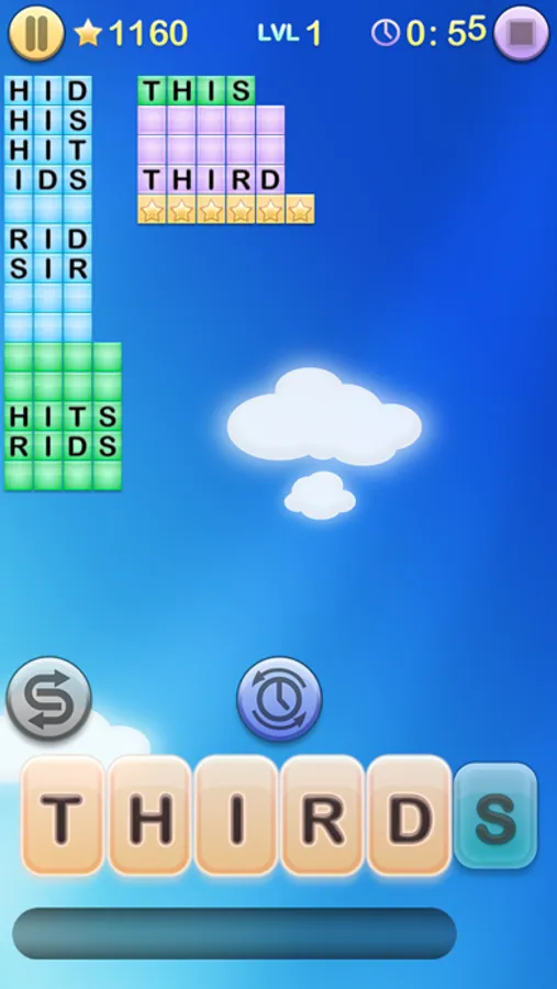 Jumbline 2 includes two additional games: Cloud Pop and Star Tower. In Cloud Pop, your goal is to pop as many clouds as possible, by spelling words out of the letters carried in each cloud. In Star Tower, your task is to build the tallest tower you can, before it sinks into the ground, by making and staking words out of an infinitely jumbled line of letters. The larger the word, the slower your tower sinks, so scramble and twist your brain to think big!