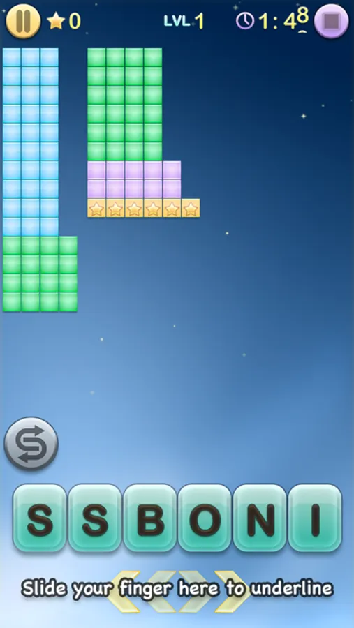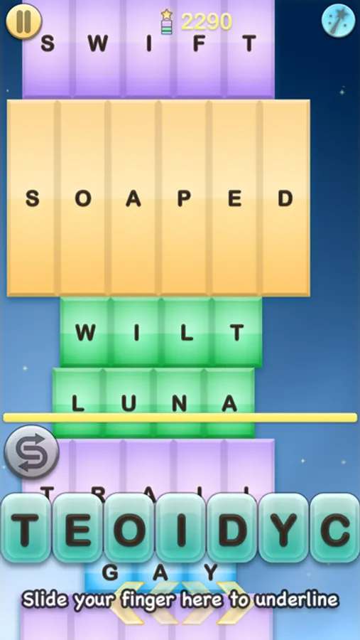 Jumbline 2 includes two additional games: Cloud Pop and Star Tower. In Cloud Pop, your goal is to pop as many clouds as possible, by spelling words out of the letters carried in each cloud. In Star Tower, your task is to build the tallest tower you can, before it sinks into the ground, by making and staking words out of an infinitely jumbled line of letters. The larger the word, the slower your tower sinks, so scramble and twist your brain to think big!