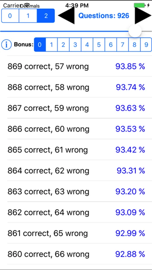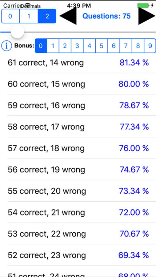 Just move the slider to select the number of questions of the test, and the grade list below will automatically update to show you all the grades according the the number of mistakes (incorrect answers).