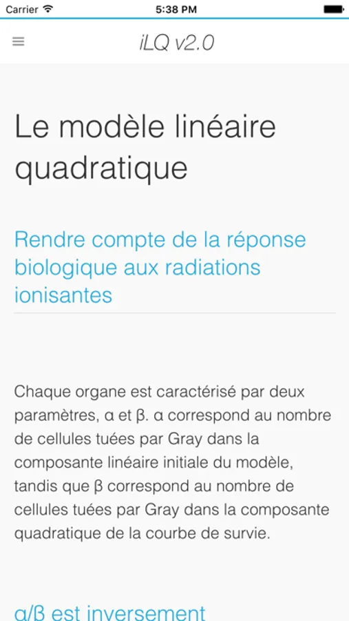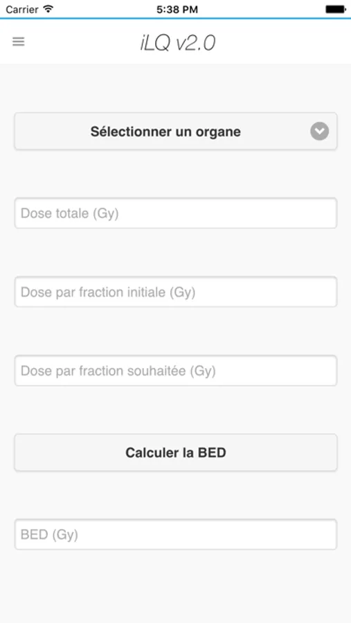 iLQ est une application permettant de calculer des équivalences de dose en radiothérapie qui utilise le modèle linéaire quadratique. L'utilisateur peut sélectionner un organe à risque (moëlle, cœur, poumon, foie, etc) ou choisir le rapport α/β de son choix.