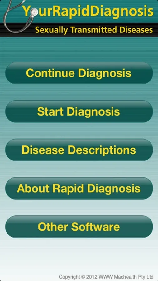 Rapid diagnosis STD is an application designed to assist with the diagnosis of genital and sexually transmitted diseases, including those that may or may not be transmitted sexually and those that may be mistaken for sexually transmitted diseases.