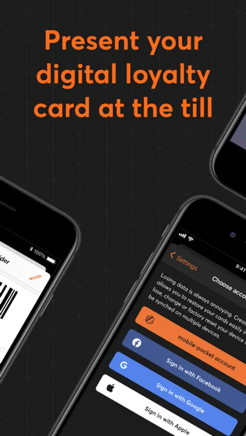 + Backup, synchronize and restore your loyalty cards and membership cards with the account function: Register via mail (mobile-pocket wallet account) or with your Facebook-, Google- or Apple account