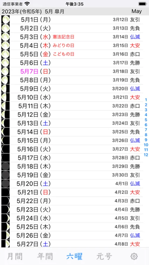 月齢の絵、旧暦、六曜を表示します。