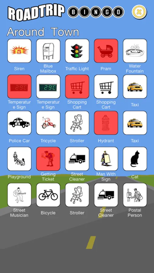 An assortment of bingo tiles of commonly seen items while on a road-trip… or just around the town. Cars, animals, scenery, signs, etc.