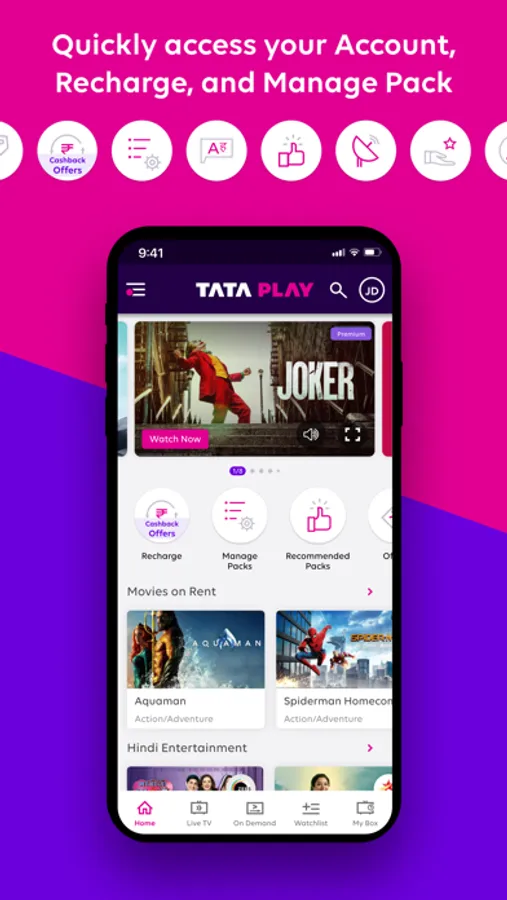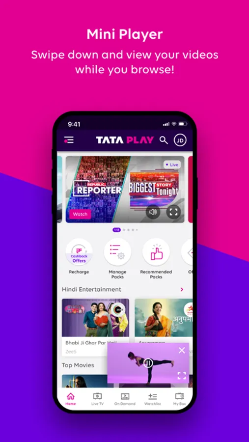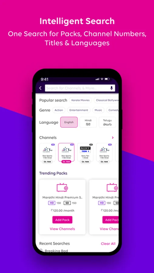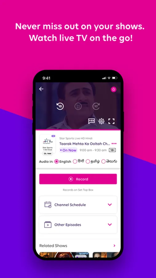 Explore the Tata Play mobile app to unleash a truly personalized experience. Watch live TV & Manage packs in 9 languages: English, Bengali, Hindi, Kannada, Malayalam, Marathi, Tamil, Oriya & Telugu.