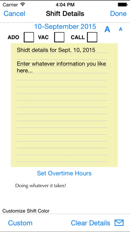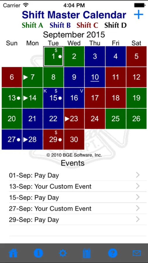 Fully configurable Shift Calendar app for Firefighter, EMS and Paramedic Professionals. This app is now the flag ship app in the series and provides for full customization for up to 4 platoons/teams with single shift or first/second shift on a shift pattern rotation of up to 35 days in length.