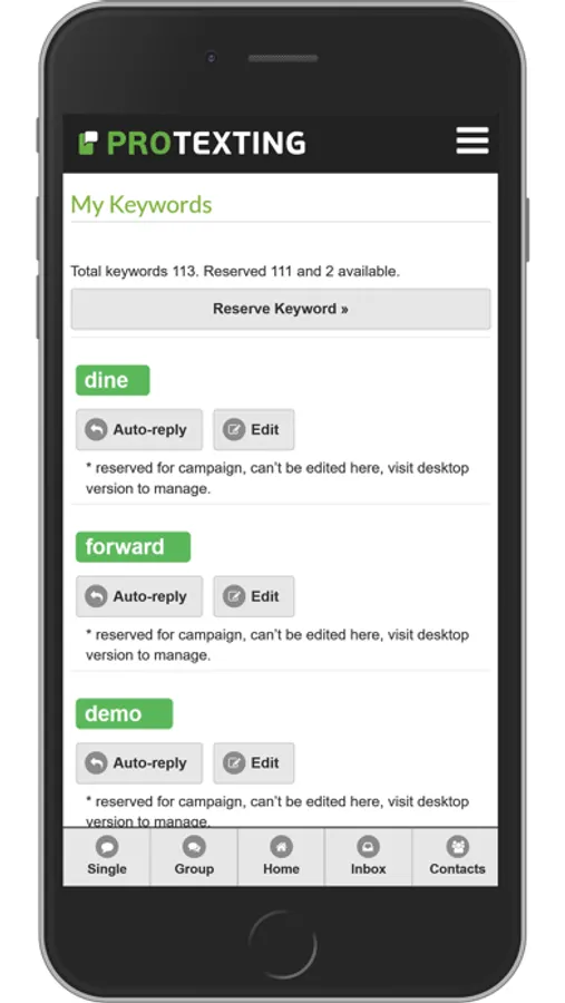 This app will allow you to send out and schedule Group and Single Text Messages, check your mobile Inbox, manage your Contacts and Mobile Keywords from anywhere using your mobile phone.