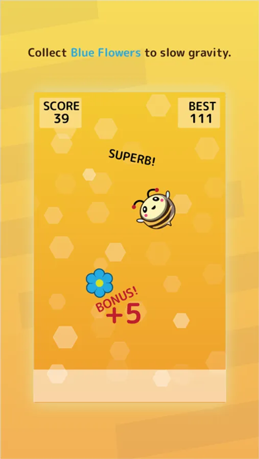 But not to worry! To help you, power flowers will appear on occasion. Collecting these flowers gives Tumble Bee extra abilities. Blue flowers give Tumble bee's tiny wings a small boost and slightly decrease the rate at which he falls. Red flowers make Tumble Bee grow in size, making him easier to tap. Collecting two flowers of the same colour in succession will add a bonus of 5 points to your score. But be careful, power-ups only last for a limited amount of time and the change back to normal may catch you off guard!