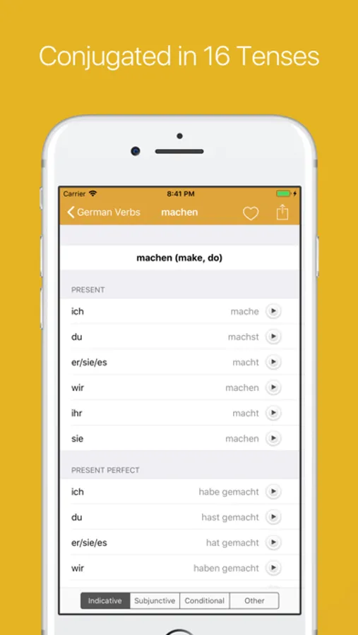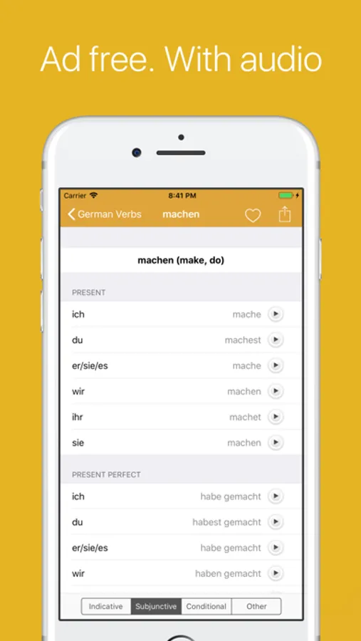 Now with audio!! Not sure how to pronounce a verb? You can now hear how every verb is pronounced. Just tap on the button next to the conjugation. Verbs with audio have a speaker symbol next to them.