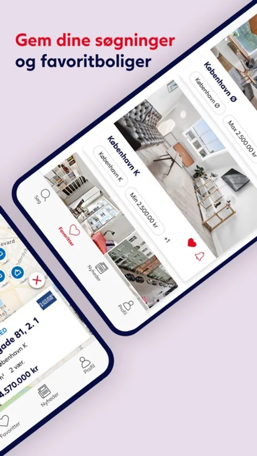 Du kan gemme op til fem søgninger og boliger uden at være logget ind. Opretter du en profil, kan du gemme helt op til 30 søgninger og lige så mange favoritboliger, som du ønsker. Du kan overvåge dine boliger, både via push-beskeder og via e-mail. Så får du besked, så snart der er nye boliger til salg i dine gemte søgninger.