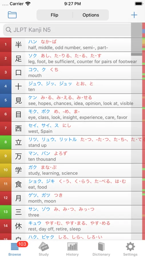 Complete kanji and vocabulary required for the JLPT exams (N1 to N5), school grade kanji (grades 1 to 9), kana and joyo kanji (new and old).