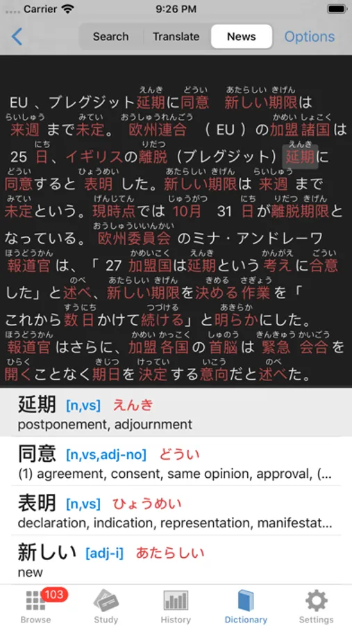 Read today's headlines in Japanese, translated into furigana and English definitions ready for study.