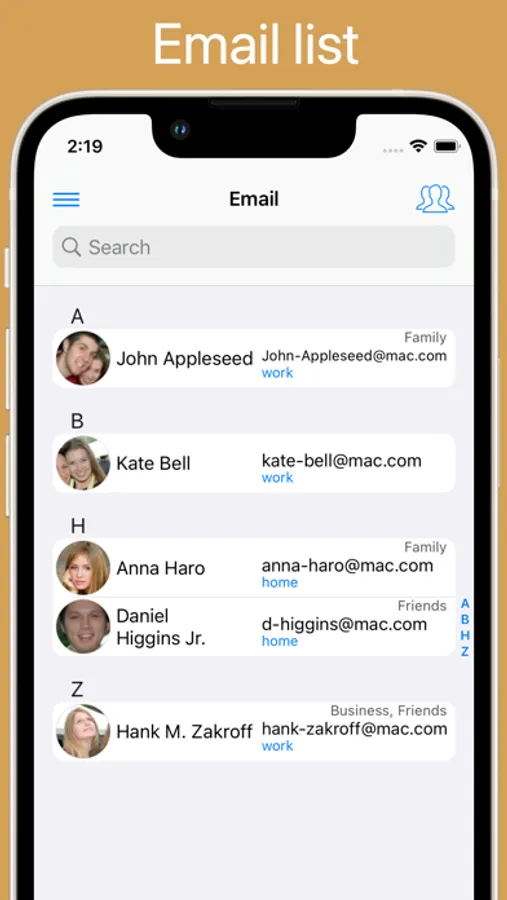 The search function enables to search for different fields within all your contacts on your device. The birthday list displays upcoming birthdays ordered by date.