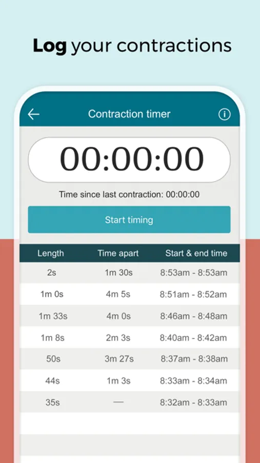 • Contraction Timer: Track contractions during late pregnancy and labor