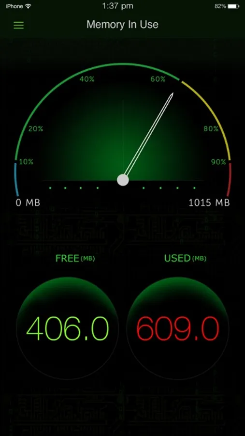 Shows the used and free iPhone memory available as used by other apps. This is shown in an excellent speedometer animation view. Double tap home button, and see other apps in use. Close out the other apps, and see the memory being reclaimed in this app, when the speedometer shows the free memory available increase.