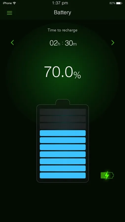 This view shows the battery available for discharge, how much time to recharge to make it full, and when it is charged to FULL, displays an indication, as "FULLY CHARGED", as opposed to quick charge. It has glow panels on the top to let you know, how much battery is available.