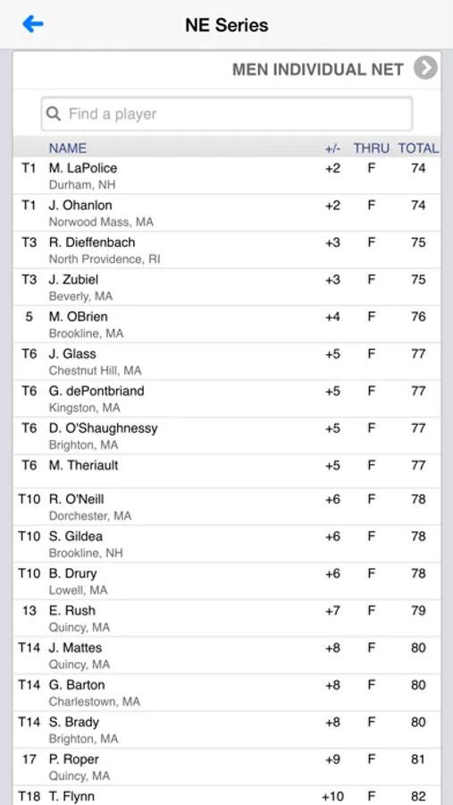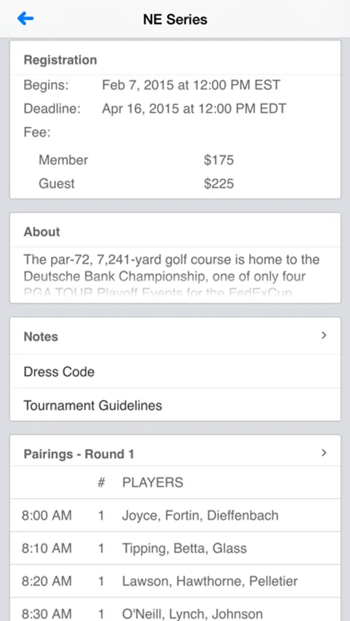 • View New England Series tournament info and leaderboards.