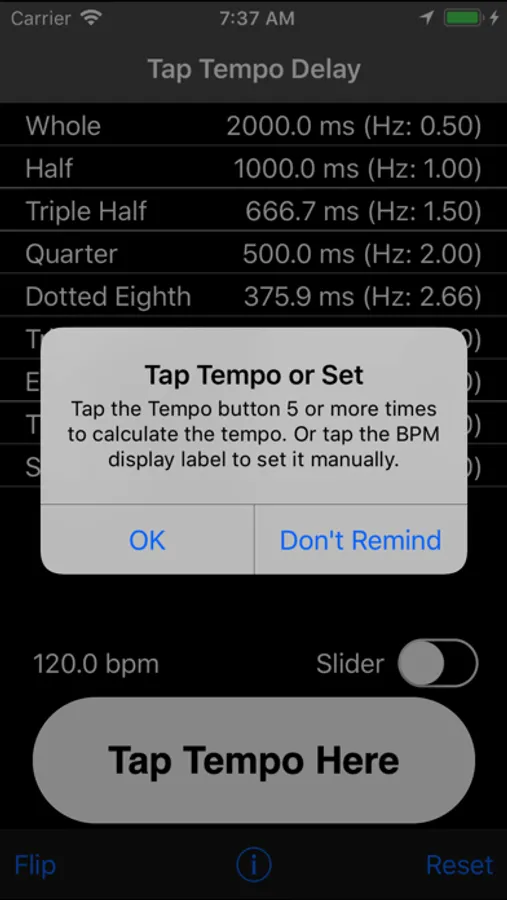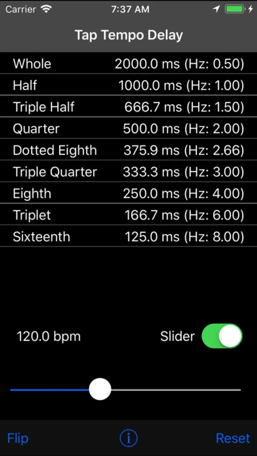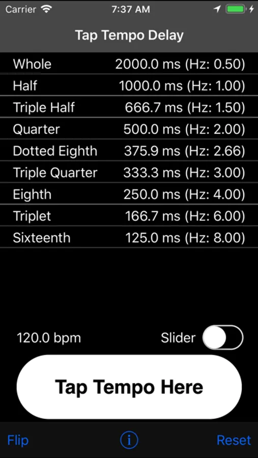 Simply tap a quarter note on the "Tap Here" button and you will instantly know the beats per minute of the song, and also the appropriate milliseconds for musical notes for your delay effects!
