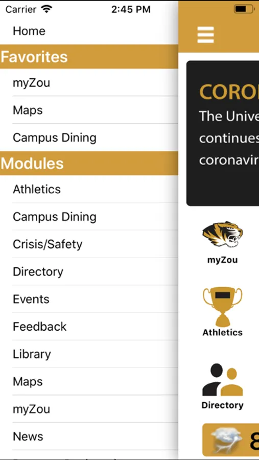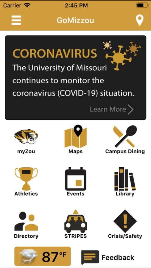 GoMizzou is a free iPhone app designed to bring University of Missouri information to your mobile device. GoMizzou provides access to the MU directory, an interactive campus map, news feeds, an events calendar, campus dining menus, course catalog information, STRIPES information and feedback. Future development continues.