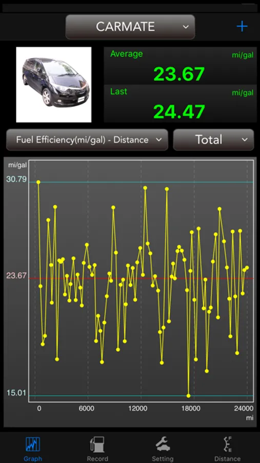 ・View your refueling and other expenses record by graphs and lists. Graph can show you statistical data of “fuel efficiency - distance”, “fuel efficiency - period”, “refueling expenses - period”, “total expenses - period” with different periods.