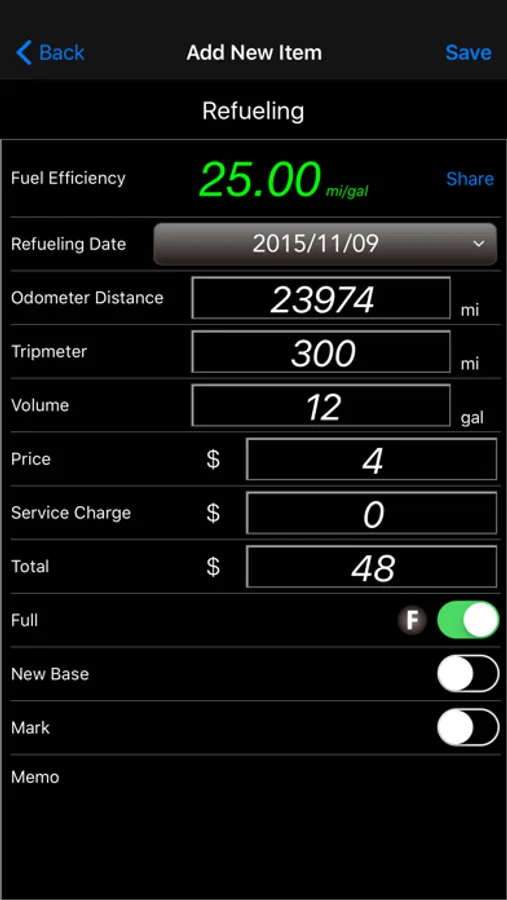 ・Add refueling quantity, distance of odometer, price by either keypad or picker entry and memo is also available for your every record.