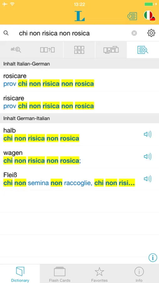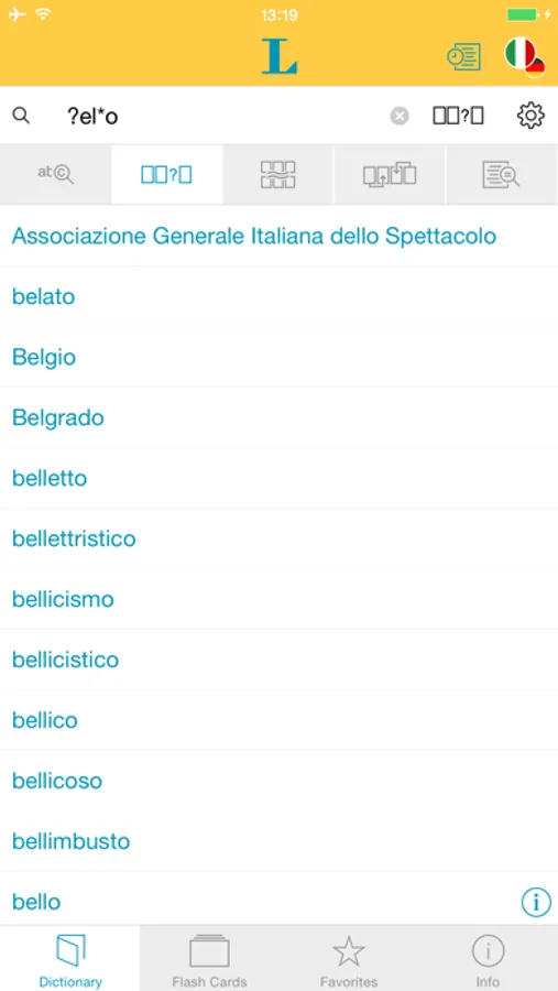 • Inflexion function for search words in all grammatical forms (Italian only).