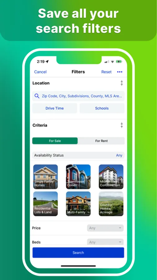 • Filter search criteria by what’s important to you, including proximity, price, square footage and more.