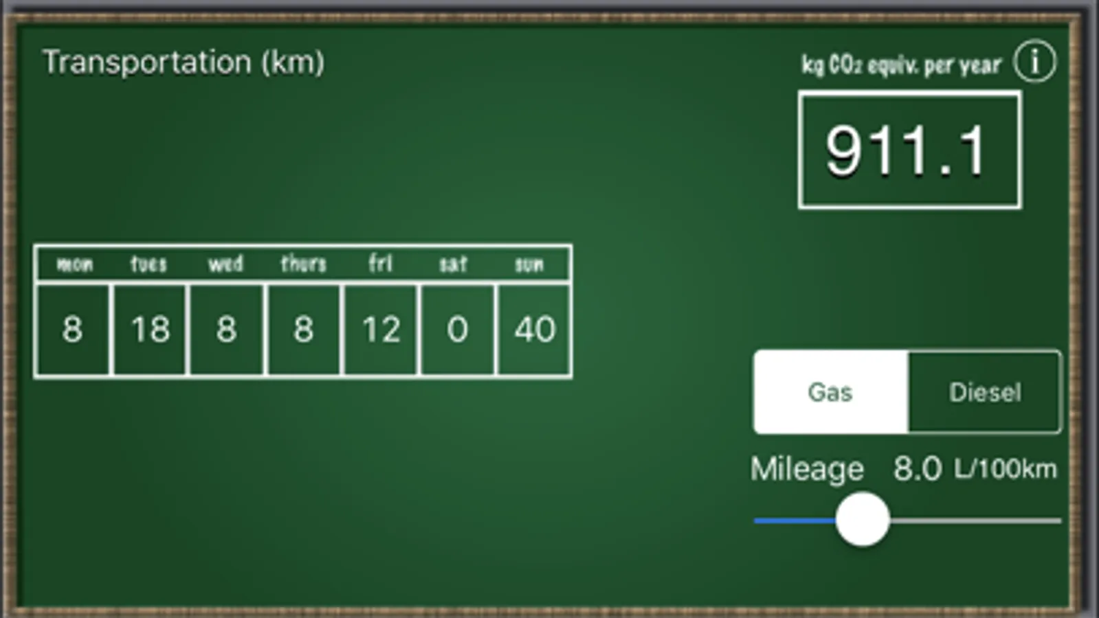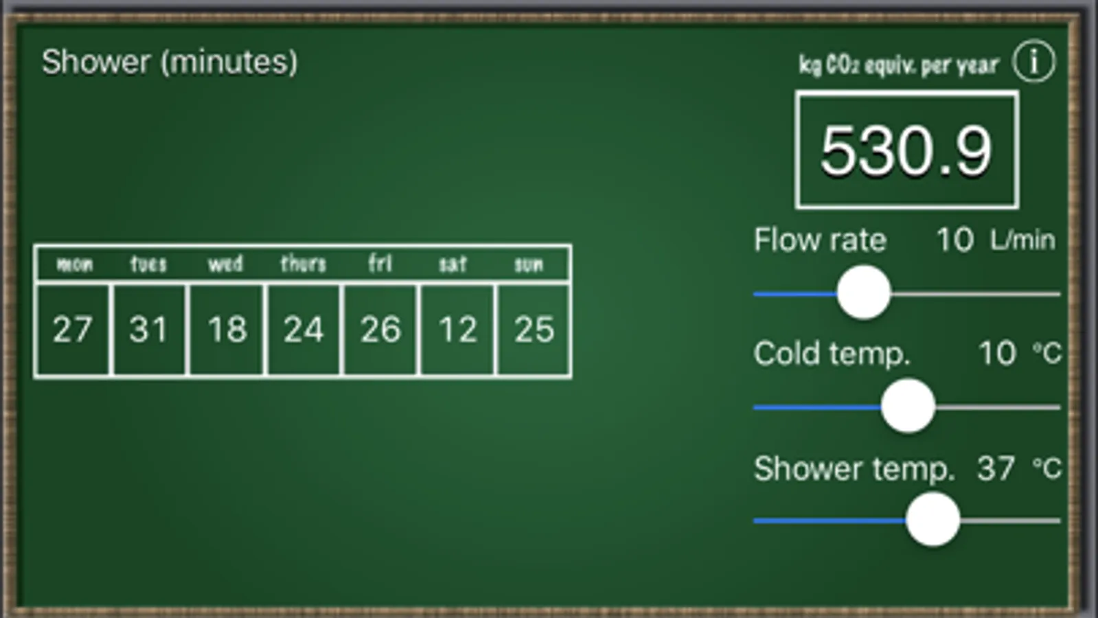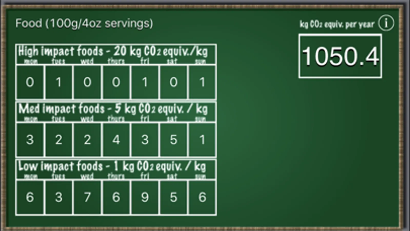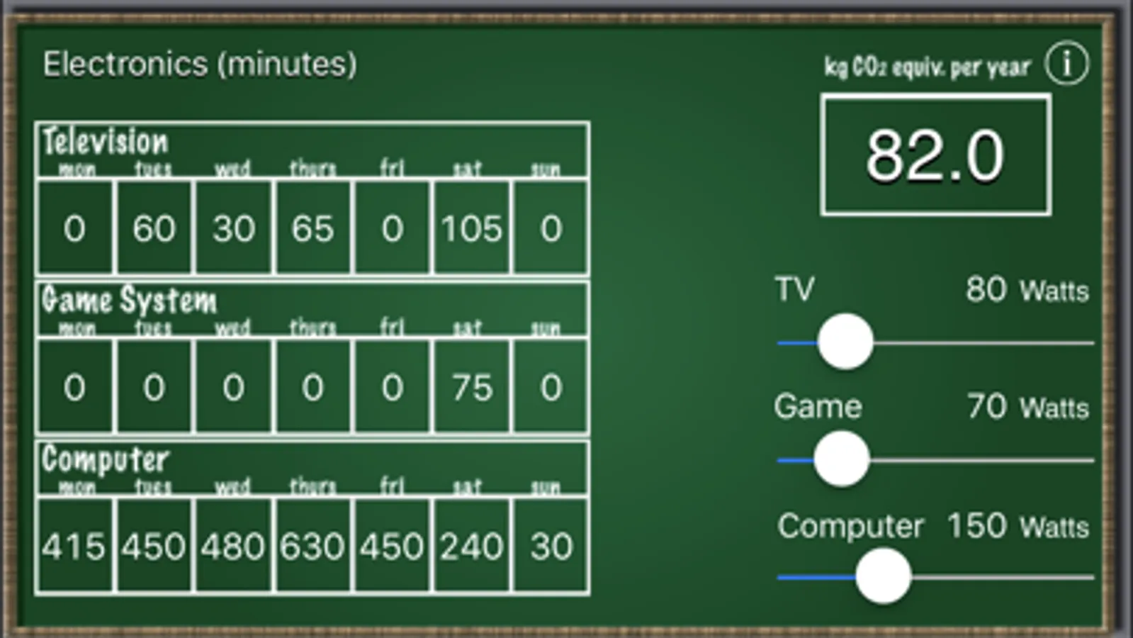 Our MathTappers: Carbon Choices app is designed to help users (middle school students) become more aware of the amount of C02 equivalent (C02e) pollution introduced by some their lifestyle choices. Note, to keep things simple, many sources/choices are not included in this app (e.g., heating/AC, non-food consumables, etc.), rather it is focussing on only a few of the consumption choices that middle school students might typically be making. Users begin by tracking/estimating their consumption over a week in four main areas (showers, entertainment, travel and food). Their impact is then assessed in terms of an estimate of the annualized kg of CO2e generated across those consumption areas.
