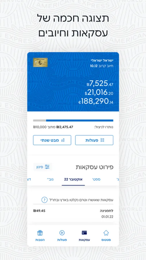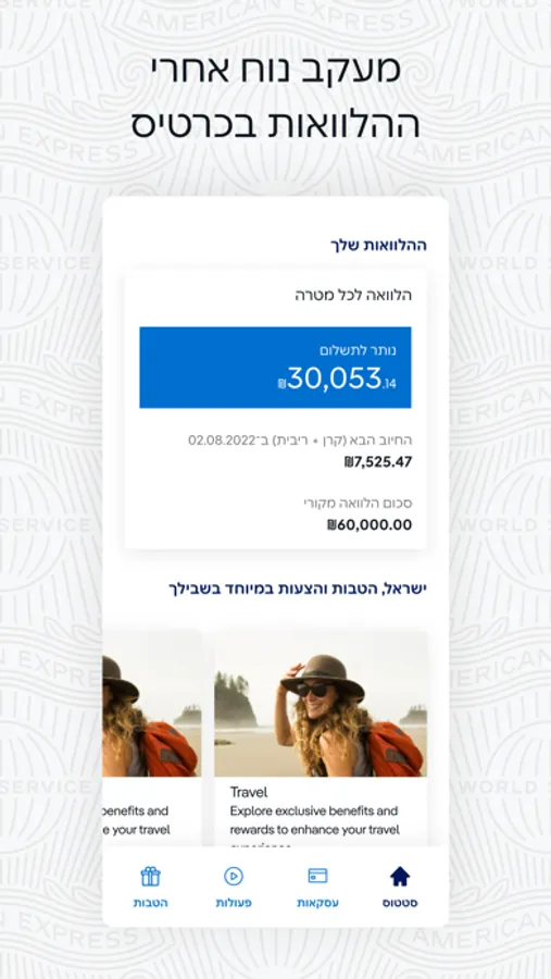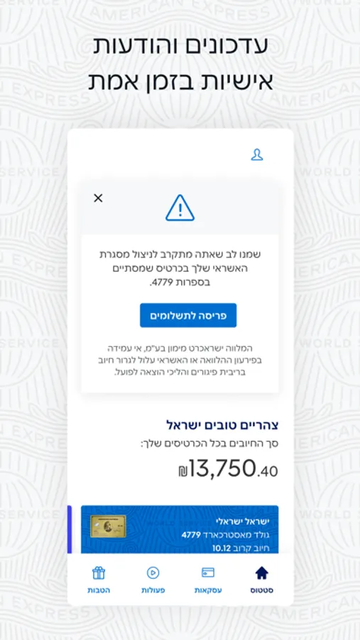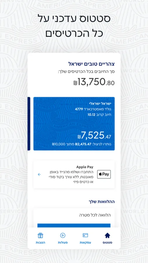 סטטוס החשבון שלך - כל המידע שחשוב לדעת על הכרטיסים, הלוואות, הנקודות שצברת, כבר בכניסה לאפליקציה.