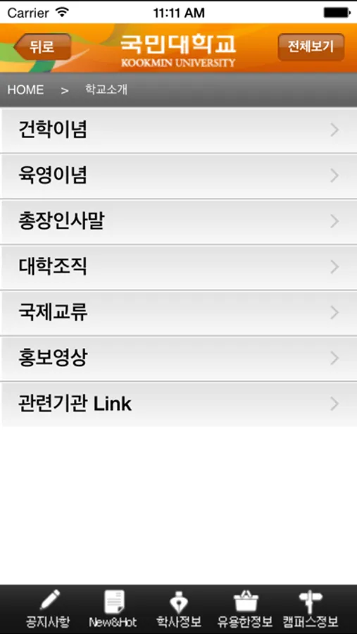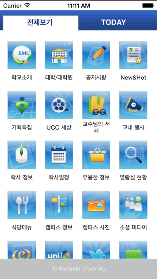 국민대학교 앱은 홍보팀에서 국민대학교 구성원들의 편의 및 학교 홍보를 위하여 제작한 앱으로 현재 Ver 1.5.0 입니다.