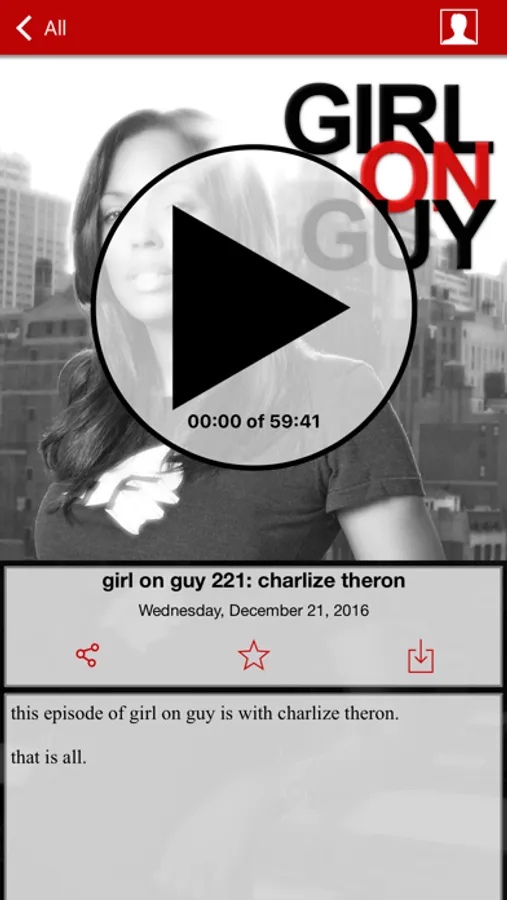 Get Girl on Guy with Aisha Tyler immediately — faster, harder, better, into your face. With the Girl On Guy app you are always connected to the latest killer episode, right on your phone, whenever you want. Star your favorite episodes so you can enjoy the mind-blowing self-inflicted wounds stories again and again! This app offers total, immediate access to Aisha and Girl On Guy. If you're a true fan of the show you need to get this. Right now. Into your Face.