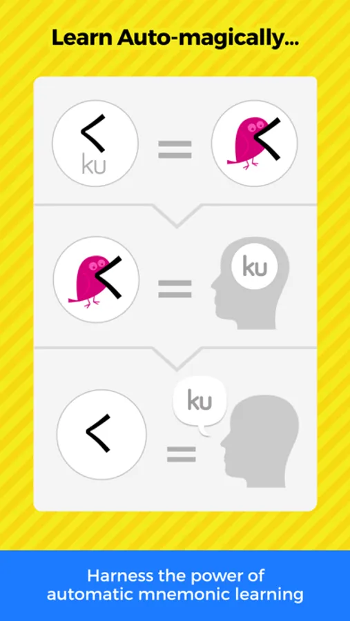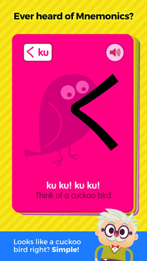 Each screen presents a Hiragana character along with a mnemonic clue and audio clip. Read the clue, listen to the clip and move on to the next one. The alternating bold colors will 'reset' your brain so you start fresh with each character. Then take a quiz! You will be amazed at your ability to recall Hiragana after just a few minutes.