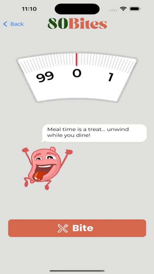 Can you feel any sensation of fullness? If not, feel free to continue eating. However, make sure to track when you start to feel full. The app's counter goes as high as 99 bites. If you don't reach a sensation of fullness within this limit, perhaps try again at another meal. Remember, a bag of chips doesn't count as a meal.