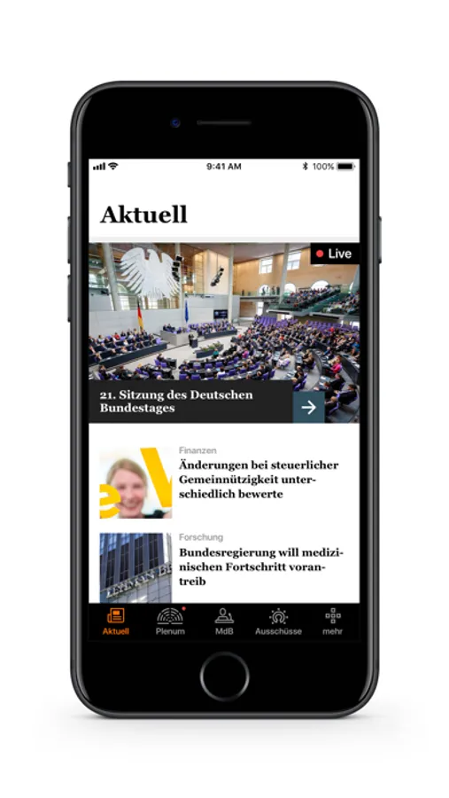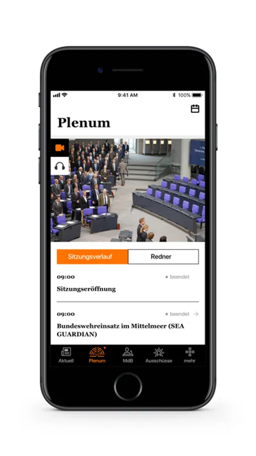 Die App startet mit Artikeln und Hintergrundinformationen zu den wichtigsten aktuellen Debatten im Bundestag. Plenarsitzungen und öffentliche Ausschusssitzungen werden live übertragen. "Plenum/TV" führt Sie während der Plenarsitzungen direkt in den Sitzungssaal: Welches Thema wird gerade behandelt, welcher Abgeordnete oder welche andere Person redet in diesem Augenblick im Parlament, welche Themen sieht die Tagesordnung für die laufende Sitzung vor. Über Audio- bzw. Video-Stream verfolgen Sie die Debatte live mit. Mit der Aktualisierungsfunktion werden Rednerwechsel und der Wechsel zum nächsten Tagesordnungspunkt sofort auf Ihrem iPhone, iPad oder iPod angezeigt.