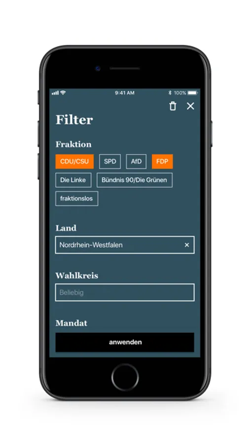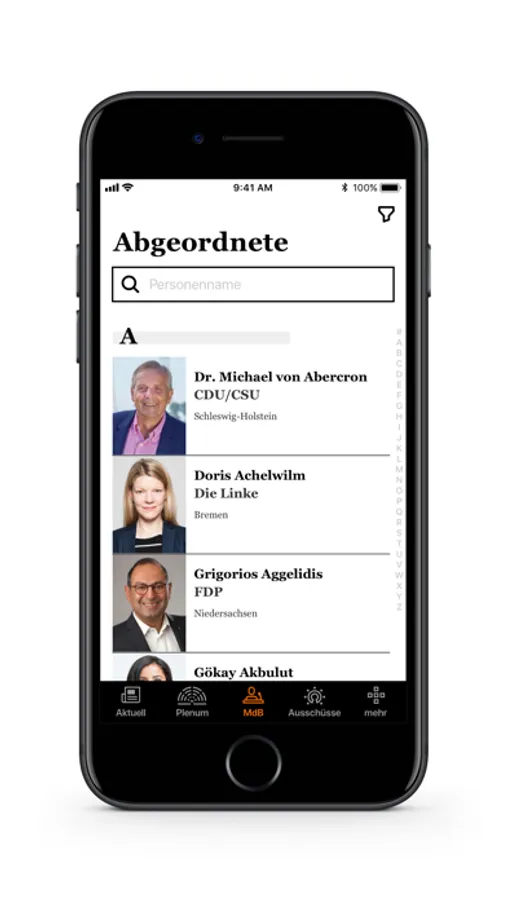 "MdB" stellt alle Abgeordneten vor. Hier finden Sie Fotos und Biografien der Abgeordneten, die veröffentlichungspflichtigen Angaben u. a. zu Nebentätigkeiten und Nebeneinkünften, und die Mitgliedschaften der Abgeordneten in den Ausschüssen und Gremien sowie Informationen darüber, wie Sie mit den Abgeordneten in Kontakt treten können.