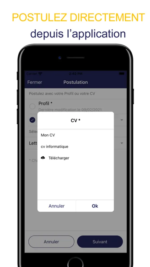 - Postuler en quelques clics où que vous soyez sans quitter l’application.