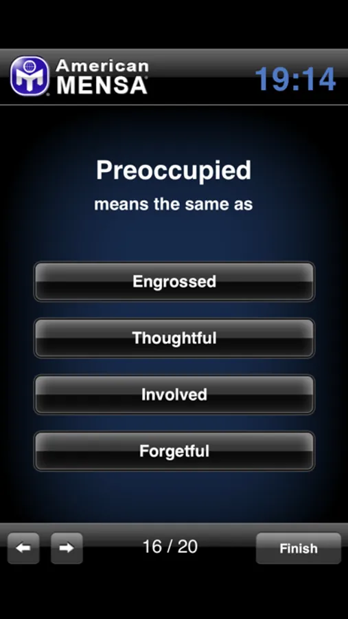 American Mensa Brain Test provides genuine Mensa questions of the variety used in official Mensa tests. Dozens and dozens of different questions ensure that every test you take is unique.