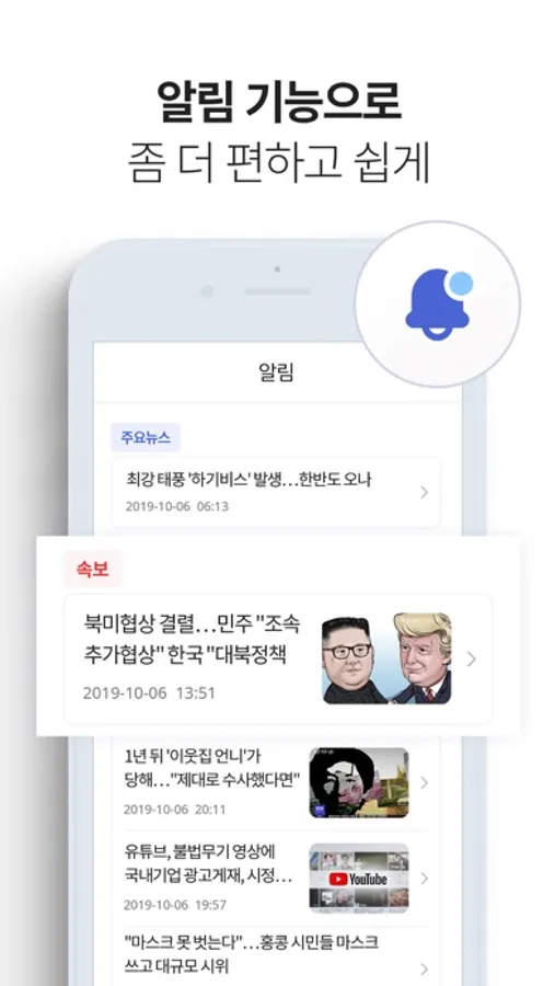 2. 알림 : 속보, 주요뉴스 및 뉴스 프로그램 방송 시작 안내에 대한 개인 맞춤형 알림으로 편하게 뉴스 콘텐츠를 확인할 수 있습니다.